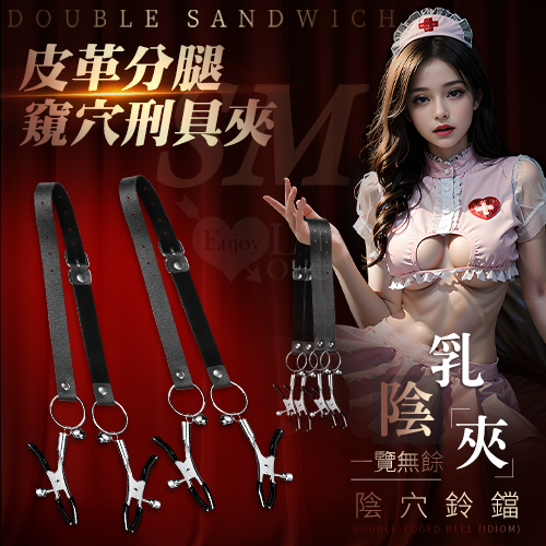 【陰乳の調戲】皮革鈴鐺分腿窺穴刑具夾﹝乳陰同步四虐夾+開腿夾穴刺激﹞