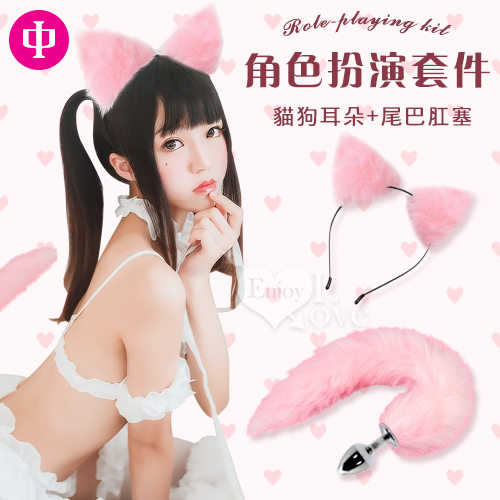 雙色粉白毛絨髮卡貓咪耳朵+尾巴肛塞角色扮演套件﹝大﹞