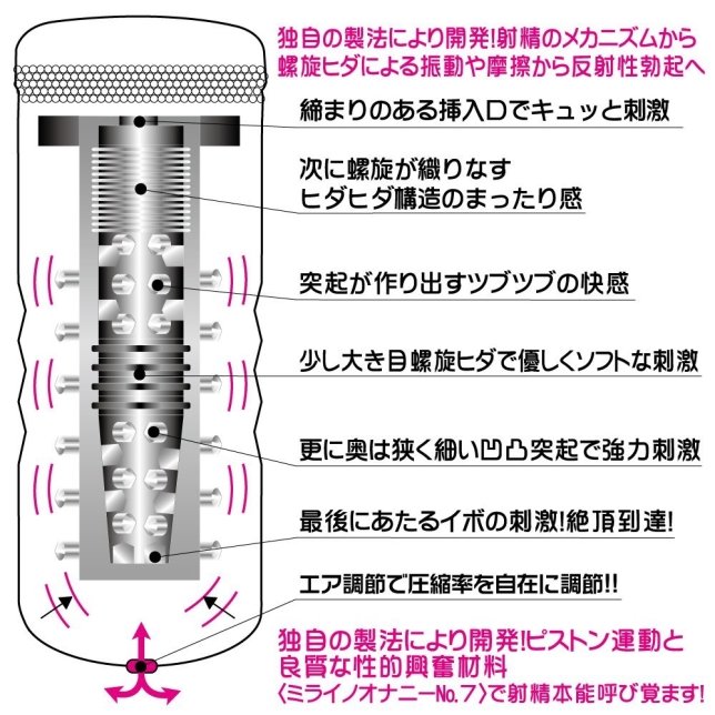 快感学から科学的に分析。長い「高揚状態」を作る構造と、しっかり刺激を与える構造を融合。人間の脳の中枢に働きかける刺激と快感を実現。螺旋ヒダによる振動や摩擦から反射性勃起へ導く。ハードカップによるハードタイプの刺激が、射精本能を呼び覚ます!