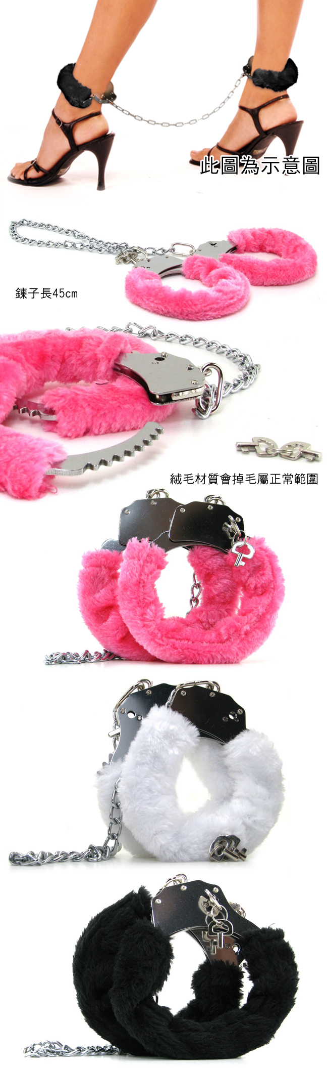 最極致的感官剌激,挑起你的性慾用於性愛行動中,體驗不一樣的情趣........ , 在性愛過程中,戴上腳銬,因為無法反抗對方的各種性愛攻勢,心裡想抗拒但卻又從身體傳來強烈的快感,而看著心愛的對方被您銬住而無法抵抗您的各種攻勢產生的心理快感,心理作用加劇了雙方的性慾,加強了感官剌激,只要體會過一次您就會愛上這種感覺。