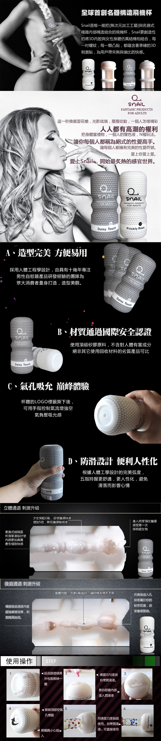 Snail是唯一能把[無次元加工工藝]與名器式複雜內部構造結合的飛機杯,Snail更創造性的將3D內腔與女性身體仿真結構相結合,每一吋螺紋,每一顆凸點,都蘊含著準確的3D刺激點,為用戶帶來無與倫比的快感。