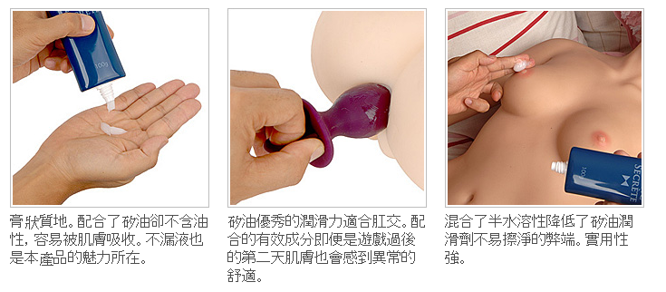 適用於肛交,自製的成分和配合率,潤滑劑中含有半水溶性的矽油。就像護膚用的化妝品般彈性的質感容易吸附在情趣用品的表面,塗在肌膚上也可以。特別適用於纖細的粘膜,遊戲後的護膚作用也相當不錯第二天肌膚會感到異常的舒適。屬於矽性卻容易脫落,操作簡單用水清洗就可以是本產品的魅力。 潤滑力超強可以長時間使用的矽油潤滑劑最適合肛交,但是不容易清洗乾淨,時常會粘到襯衫和衣褲上是這類產品的缺點。 本產品製成了半水溶性,解決了矽油潤滑劑的這一大弱點的混合類型。排除了矽性特有的油脂,具備水性潤滑劑特有的一擦就可以擦乾淨的便利。 另外,標明了所有成分使廣大使用者們用的放心,配合了玫瑰水和透明質酸鈉、胎盤提取物,增強了保護肌膚和粘膜的特性。精心研製的讓所有人都能愛上的高級潤滑劑。