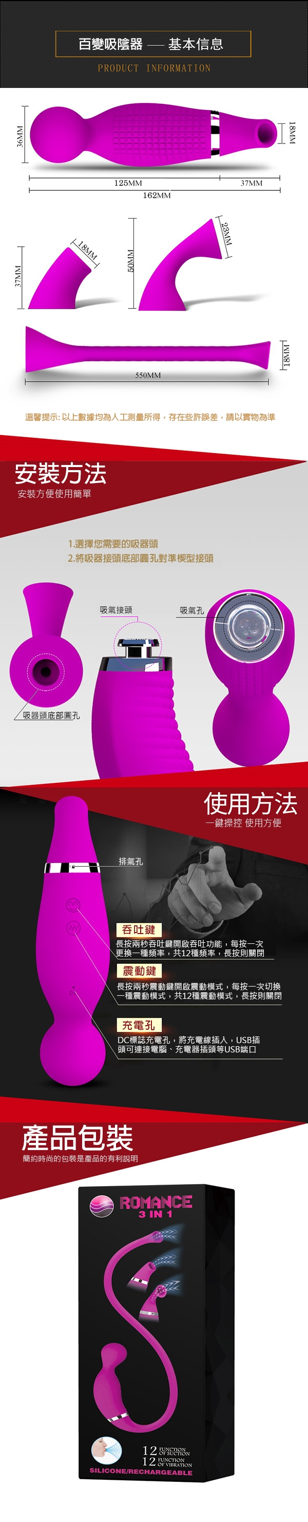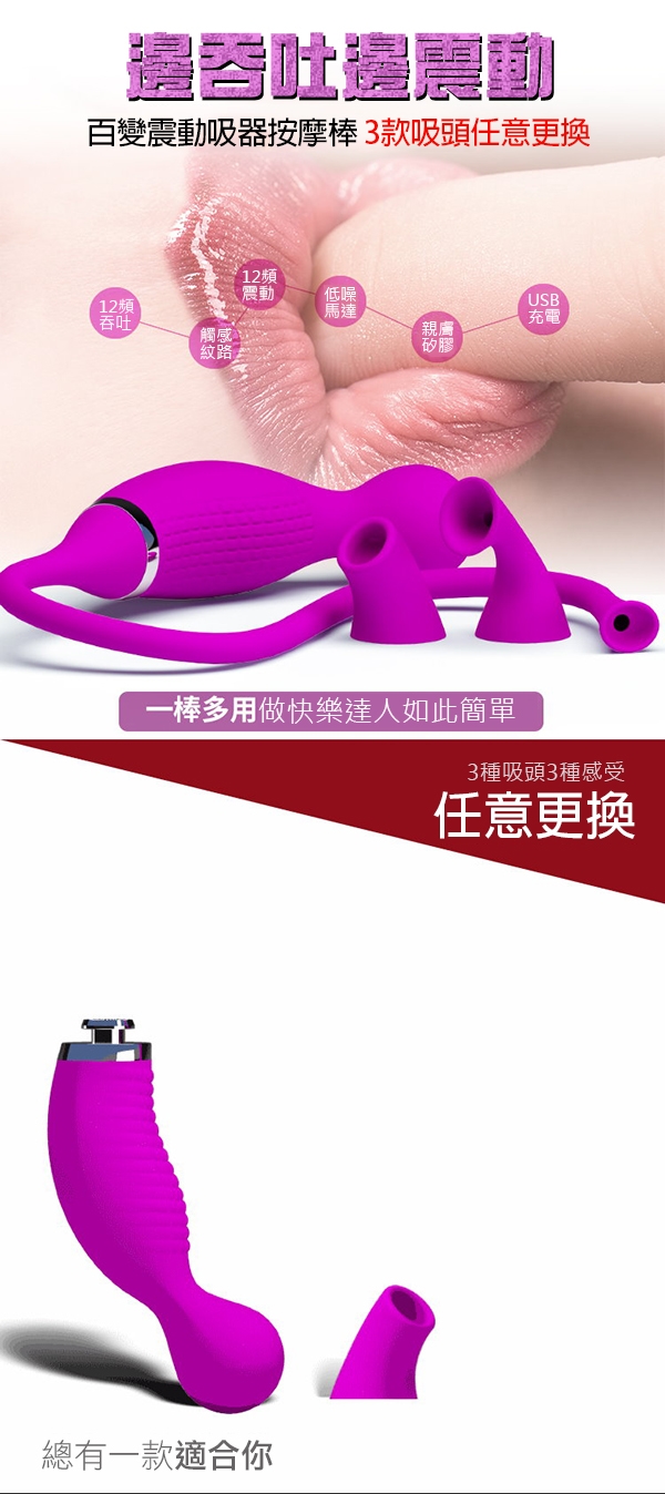 商品規格 : 用途:女性自慰之用 材質:矽膠 規格:電壓1.5V震動 / 1組(震動器 3種可替換吸盤) 電源:USB充電式 淨重:200g 總重:480g 尺寸:如圖所示 外盒尺寸:30x11.8x5.1cm 備註:內附USB充電線x1、防塵袋x1 注意:請與潤滑液共用,並保存於陰涼處,欲重覆使用,用後清水沖洗。 ※情趣用品屬於個人衛生用品,經拆封使用,無法接受退換貨!※ ※每台電腦的解析度皆不同,可能有些微色差,顏色皆以實品為主!※