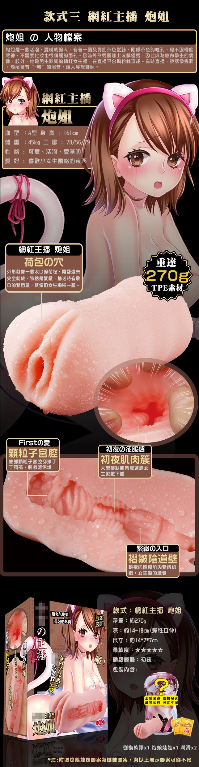 內容物:充氣枕x1、自慰器x1、6ml潤滑液x2、福利卡x1
