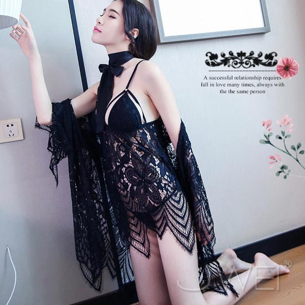 ◇◆極度羽媚.二件式性感披肩+蕾絲吊帶睡裙(黑)◆◇
