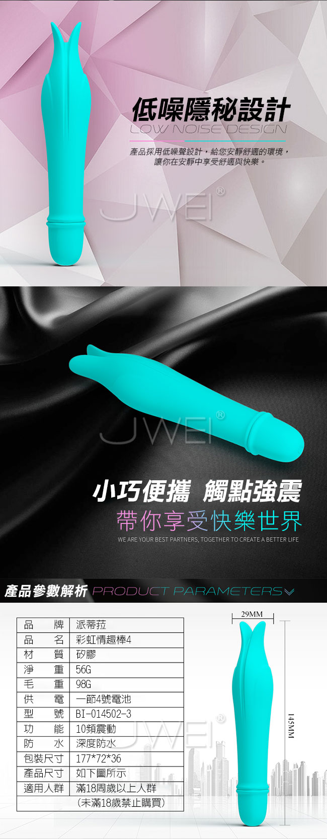 彩虹情趣按摩棒擁有10段變頻模式,可切換10種不同的觸電強震模式讓您體驗不同的愛愛樂趣!迷你便攜的外型小巧可愛,讓您一手及可掌握。雙觸點設計,符合人體工學給您一場快樂夢幻的夢幻之旅。本產品採用柔順矽膠材質加工而成,順滑材質給您溫柔的觸感,感受他溫柔的愛。採用防水設計,方便清洗讓您在浴室裡也能使用享魚水之歡唷~靜謐低噪設計讓您在安靜環境內盡享愛的私密空間!