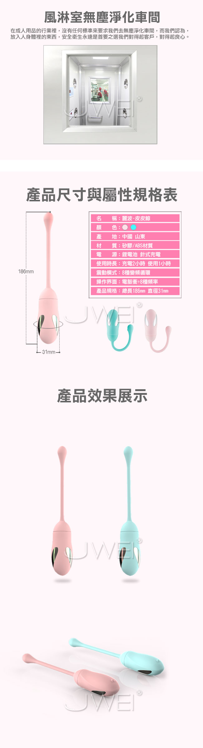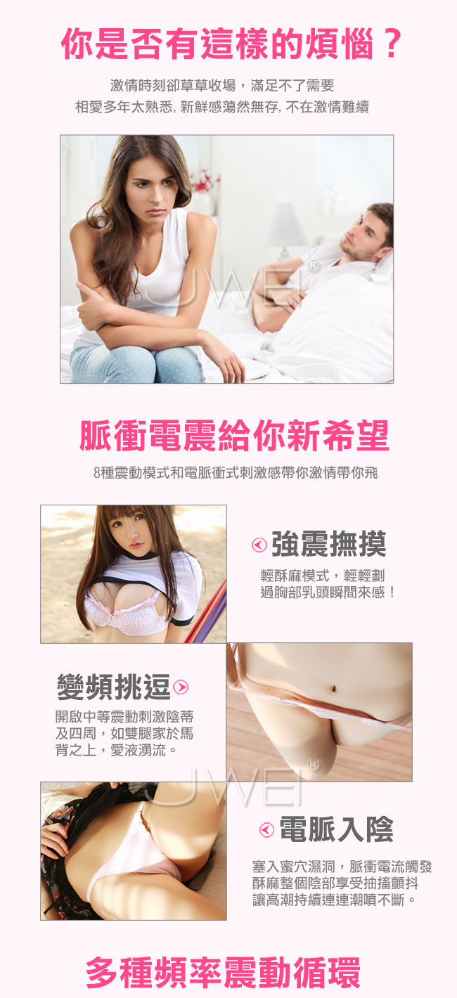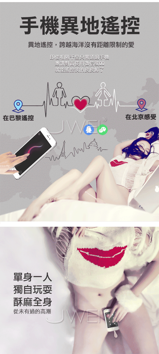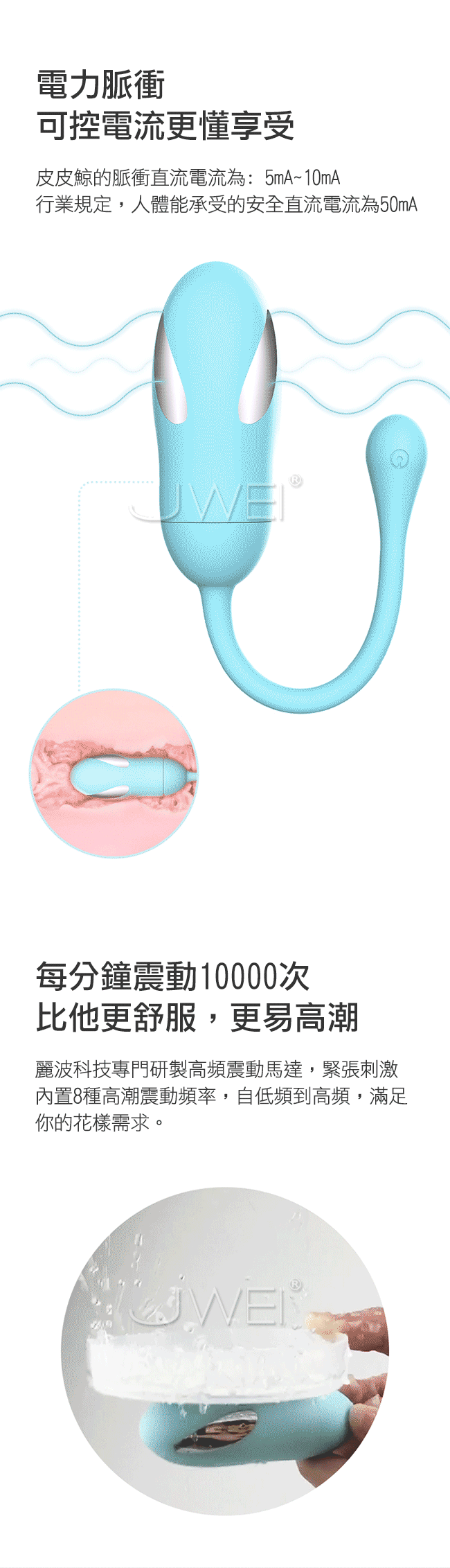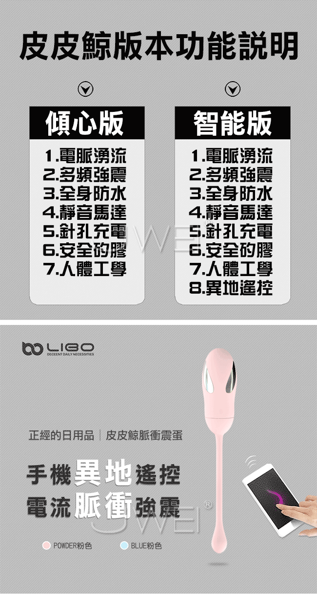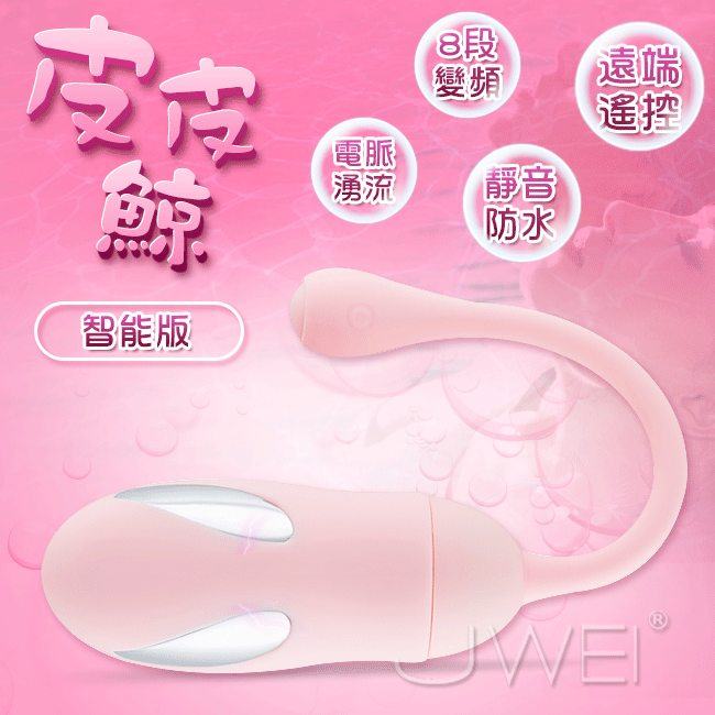 可愛的皮皮鯨電波脈衝無線跳蛋,可愛的外表擄獲許多女人們的心!皮皮鯨的脈衝電流給您觸電般的快感讓您一觸即嗨酥麻您全身上下所有神經!採用高頻震動馬達,搭配內置8種變頻從低頻到高頻,滿足您所有花樣給您想要的高潮享受。擁有超靜音聲學設計,讓您不在受到噪音的困擾喔!採用針孔式充電防水耐用,充電方便滿足您不只一次的需求。而跳蛋本體採用安全矽膠環保無毒,給您最細膩溫潤的高級體驗!此款為智能版能使用手機APP異地遠端遙控您的令一半,多種玩法任您去發掘喔~~
