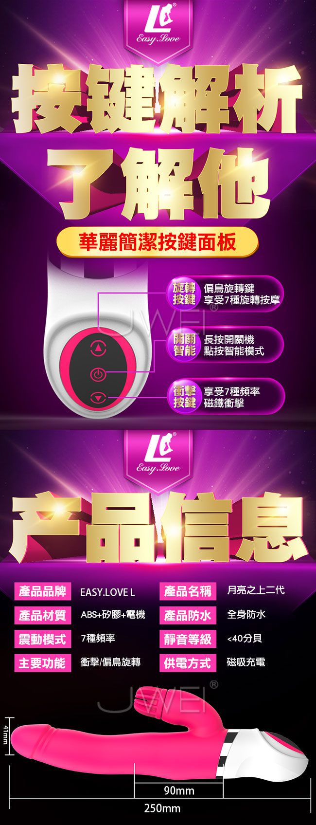 月亮之上旋轉抽插全自動按摩棒,磁鐵衝擊行程長高速衝擊你爽到起飛!擁有3款旋轉頭任你換感受三種不同感受喔~還擁有智能加溫功能開機即自動加熱如人體溫度般,給您暖暖的感受。7段變頻強力震動讓您每一頻率,都是一種姿勢。採柔軟矽膠親膚質感觸感好貼合您的私密處。
