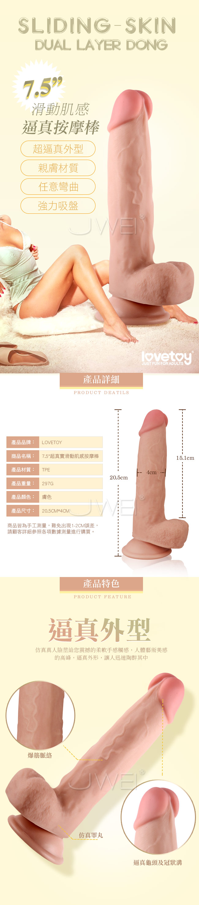 | Lovetoy.7.5吋超真實滑動肌感雙層材質吸盤仿真按摩棒