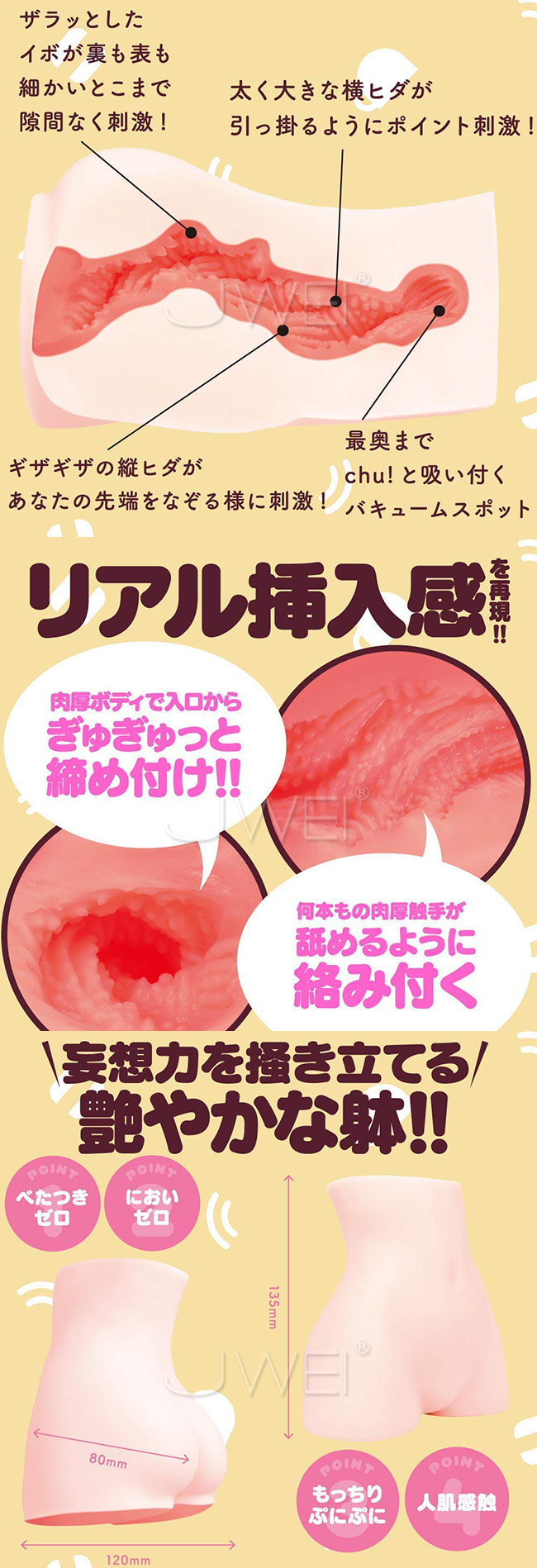 引き締まった素材のキツキツアソコに即発射!! 女の子の細い腰を再現した非貫通タイプオナホールで、小さいお尻デザインのボディです。 屈折した内部を縦ヒダ、横ヒダ、イボの肉厚触手がスパイラル状に、ギュギュッと強く絡みつきます。ヌルヌルのローションを垂らしてジュポジュポッと吸い付かれる気持ち良さをお楽しみ下さい。 視て、触って、使って感じる迫力の穴をお届けします。 片手で持てるくらのコンパクトさですが、侮ってはいけません。