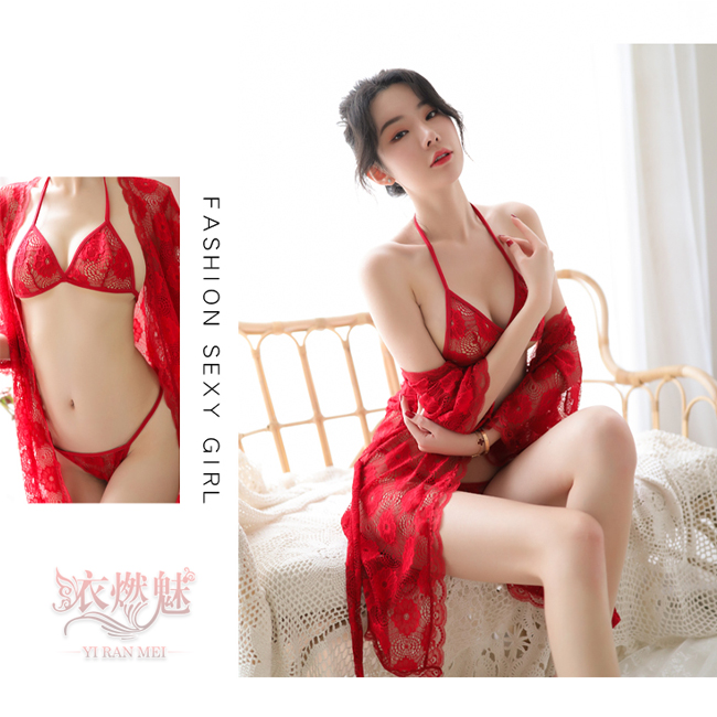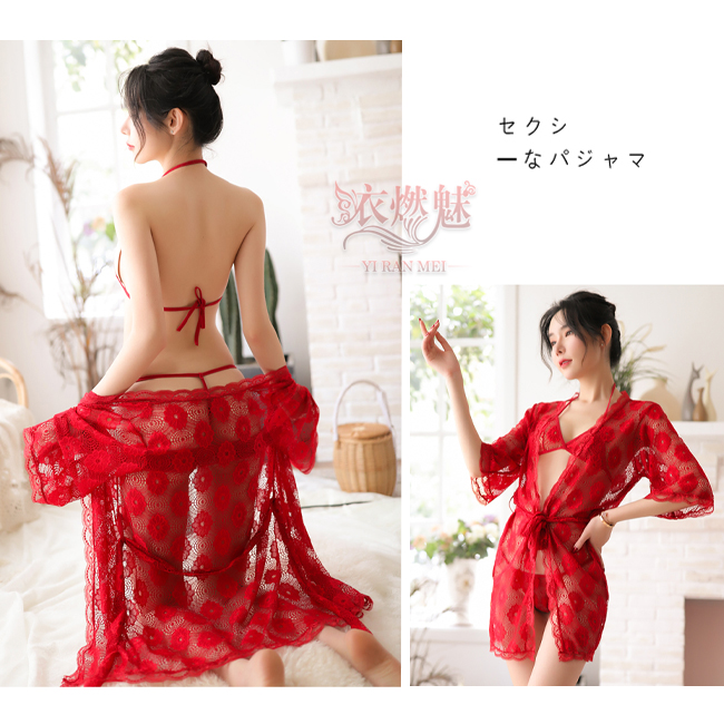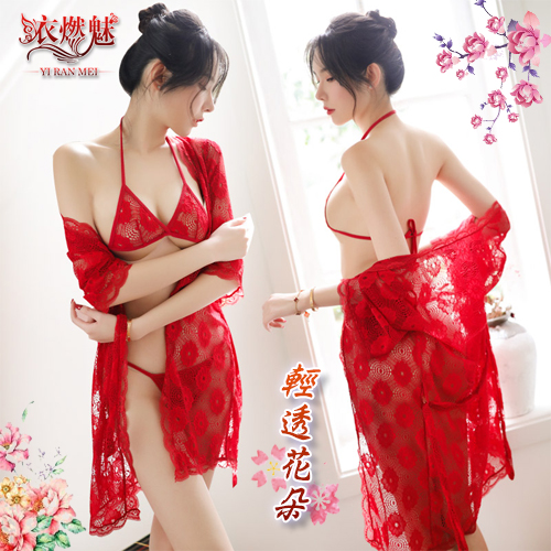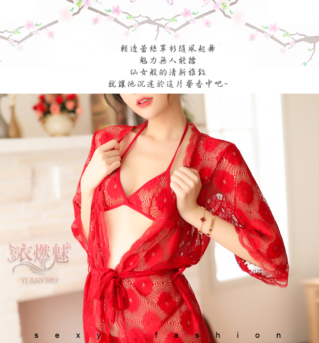 | 情趣睡衣!輕透花朵蕾絲罩衫內搭三點式浴袍組﹝紅﹞