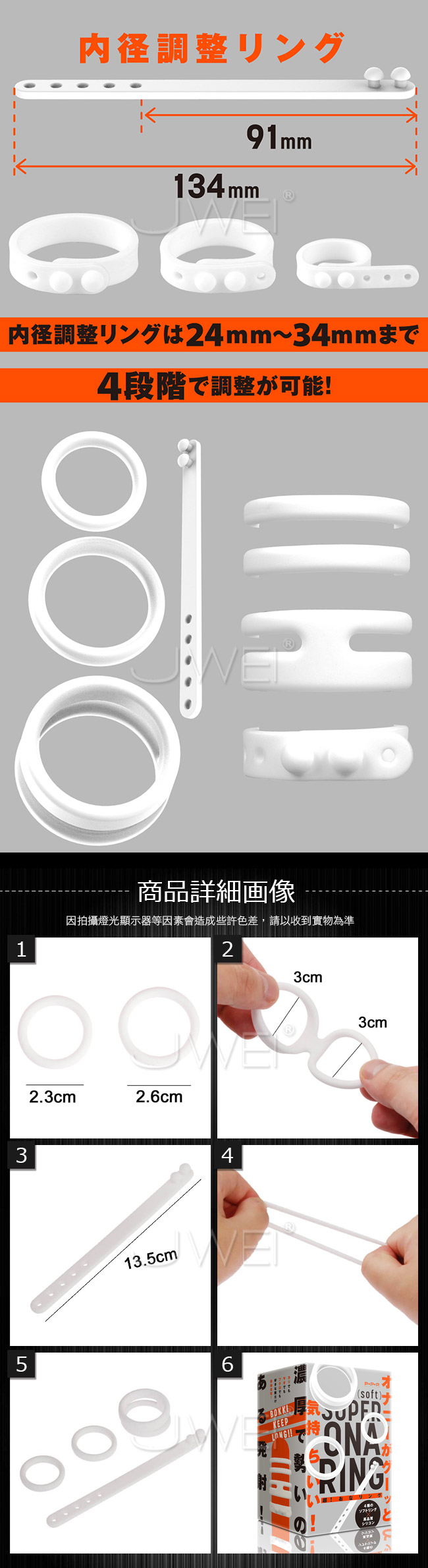 ■日本EXE原裝進口,品質優良 ■小リング直径31mm・内径23mm・幅6mm ■中リング直径33mm・内径26mm・幅6mm ■2連リング直径38mm・内径30mm・幅5mm/8mm総幅17mm ■4段階調整リング134mm・幅5mm ■重量13g(小リング1g・中リング2g・2連リング5g・4段階調整リング5g) ■高品質シリコン素材