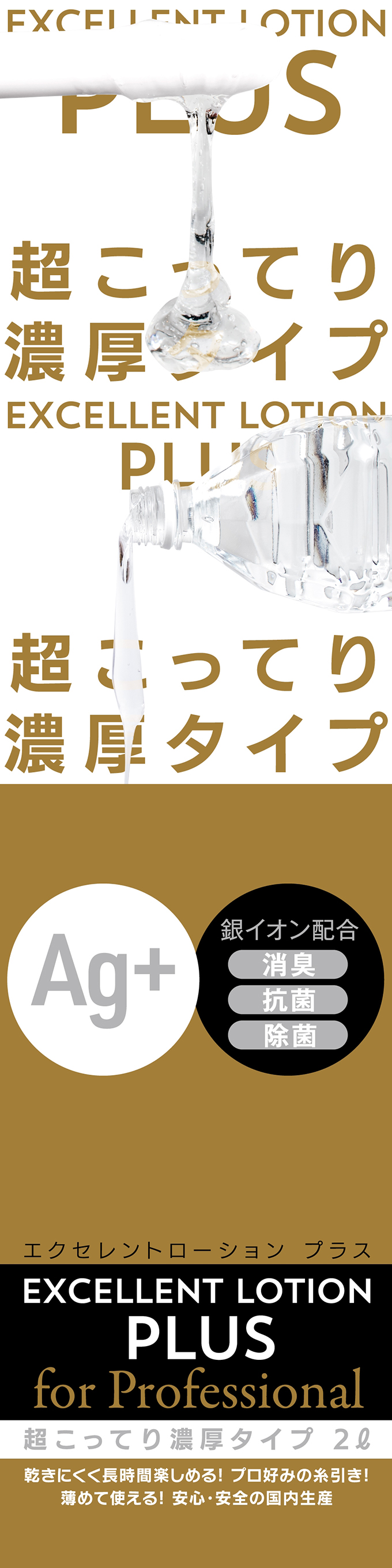 Excellence Lotion Plus新推出2公升超值裝。超濃稠款不易乾燥,可以長時間享樂。通過銀離子配方來進行清新用品,可以更衛生地使用。專家喜歡的牽絲!您可以根據自己的喜好將其稀釋或用於商業目的。安心・安全的日本國內生產。審查編號:2100359