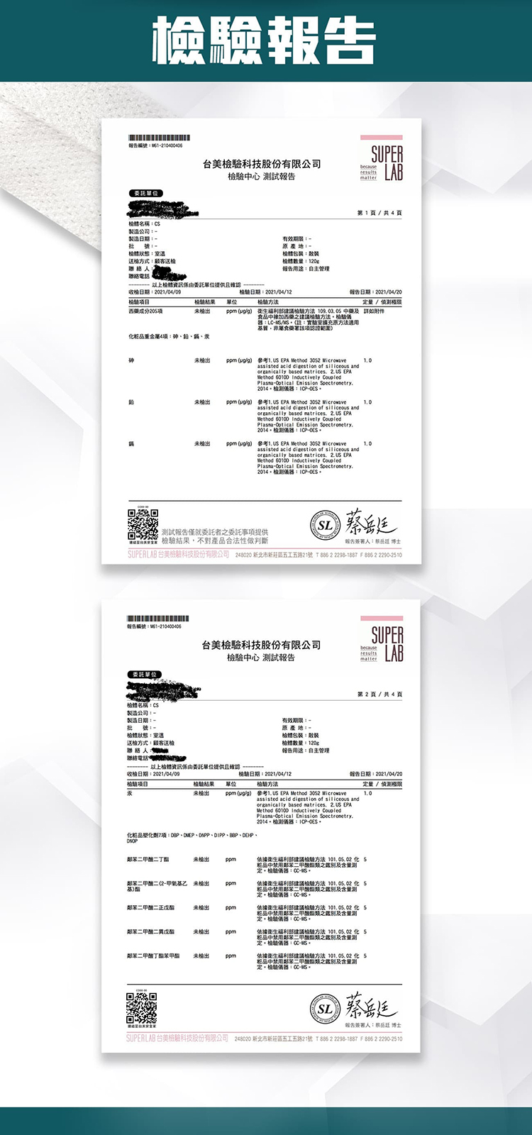 註:本商品經台美檢驗科技股份有限公司,做205項西藥成份檢驗、化妝品重金屬4項成份檢驗、化妝品塑化劑7項成份檢驗,結果都未檢出(如報告),敬請各位消費者安心使用。