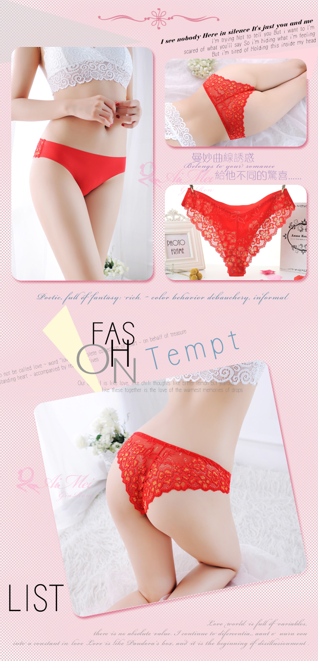 ►您現在的位置:首頁>寵愛迷戀!無痕蕾絲花瓣拼接冰絲三角褲﹝紅﹞