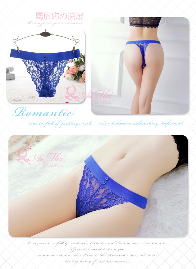 窺探夢境!彈力腰帶小鈕扣蕾絲T字褲﹝寶藍﹞