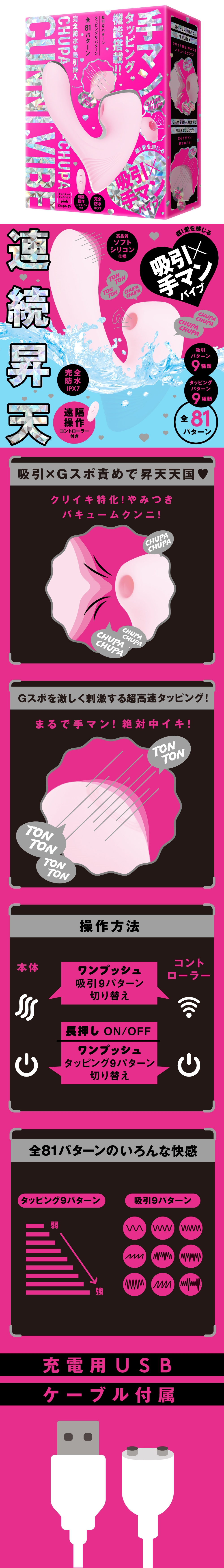 超!感受到愛的吸吮×指交振動棒!專門針對小豆豆高潮,讓人欲罷不能的真空吸陰,從溫柔的嘖吧嘖吧到激烈的啾啵啾啵吸陰,豐富的9種模式!刺激衝擊G點的高速衝擊功能,給你如被指交般的極致快感!超級爽的指交衝擊讓您絕對內部高潮!真空吸陰×專攻G點讓您連續高潮_附有遙控器,解放雙手也能享受!也推薦用於內部高潮的開發。由於會直接接觸敏感部位,所以使用了有彈性又柔軟的素材。9種吸吮模式&9種衝擊模式。完全防水IPX7等級&內附USB充電線&附有遙控器
