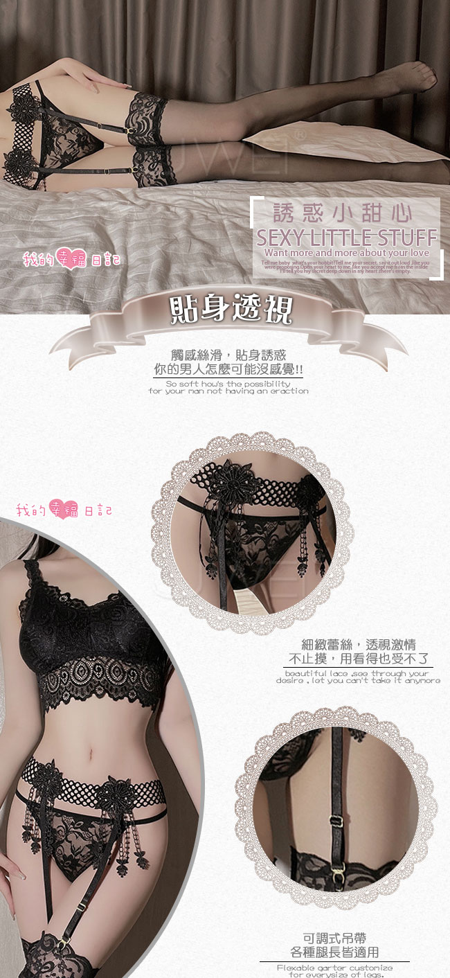 ■內容物:吊襪帶x1、丁字褲x1、大腿蕾絲絲襪x1