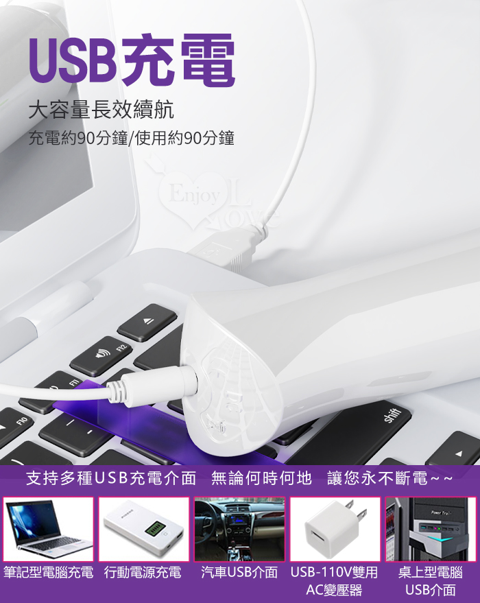 內置鋰電池,採USB充電式,約90分鐘充飽電,約可使用1.5小時。