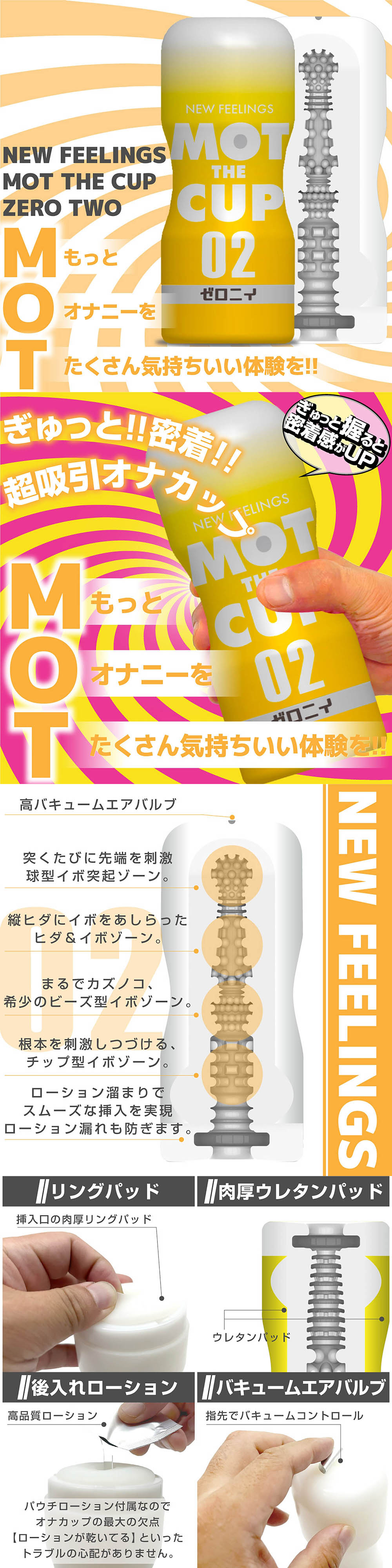 ギュっと握って刺激を調整できる超吸引カップ! 様々なイボ突起を機能的に配置したタイプ02。 高密着のタイトでキツめのオナカップ。 角イボ・丸イボ等、大小様々なイボを全面に配置した、イボ特化型構造。 通常状態でも密着度が高くハードな刺激が楽しめる本商品は、柔らかい容器を握ることで更にキツさの調整が可能。自分好みの刺激が楽しめます。 挿入口周りにはリングパッドを搭載しているので、容器が直接身体に当たらず快適に使用できます。