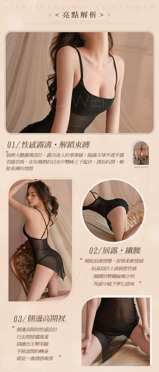 ◇◆迷濛情夜.性感露溝側邊高開衩吊帶裙2件組(黑色)◆◇