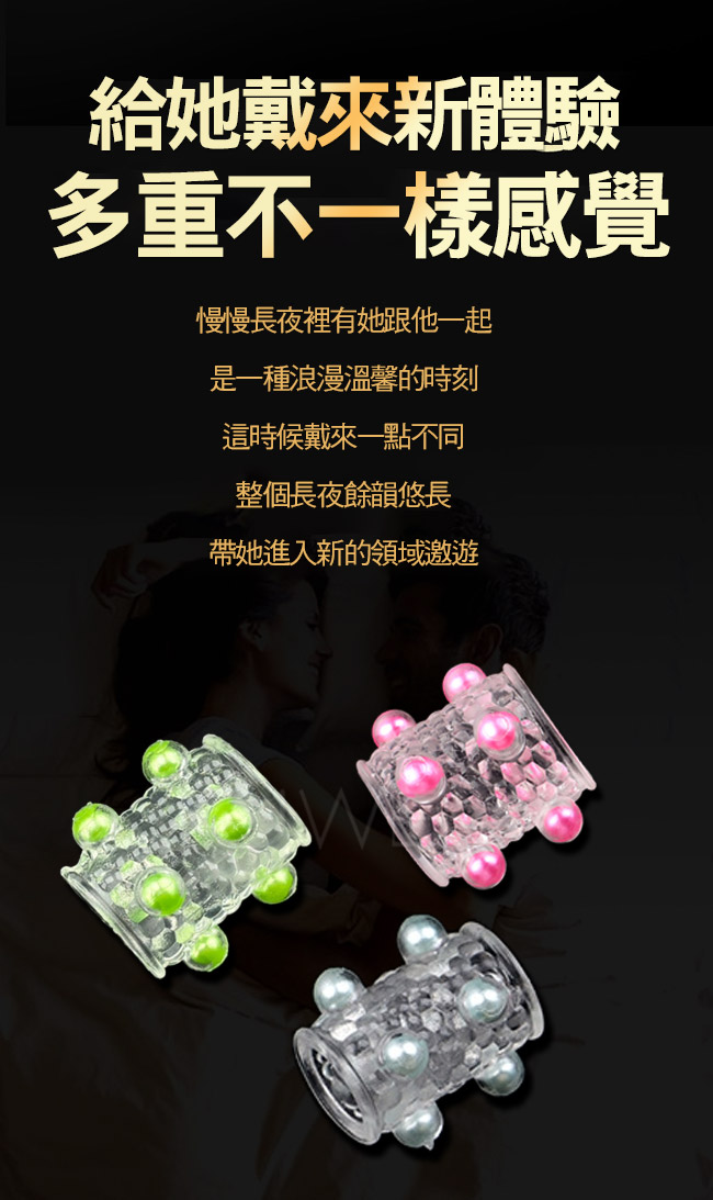 龍珠大顆粒環,3D大顆粒柔軟有力,新奇玩法柔軟材質,舒適配戴 貼合,顆粒密集柔軟,不傷私處;漫漫長夜裡有她跟他一起是一種 浪漫溫馨的時刻,這時候戴來一點不同,整個長夜餘韻悠長,帶她 進入新的領域遨遊!
