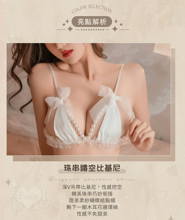 情趣比基尼!蝴蝶結柔紗可調節細肩後排釦木耳花邊珠串設計兩件組﹝黑﹞