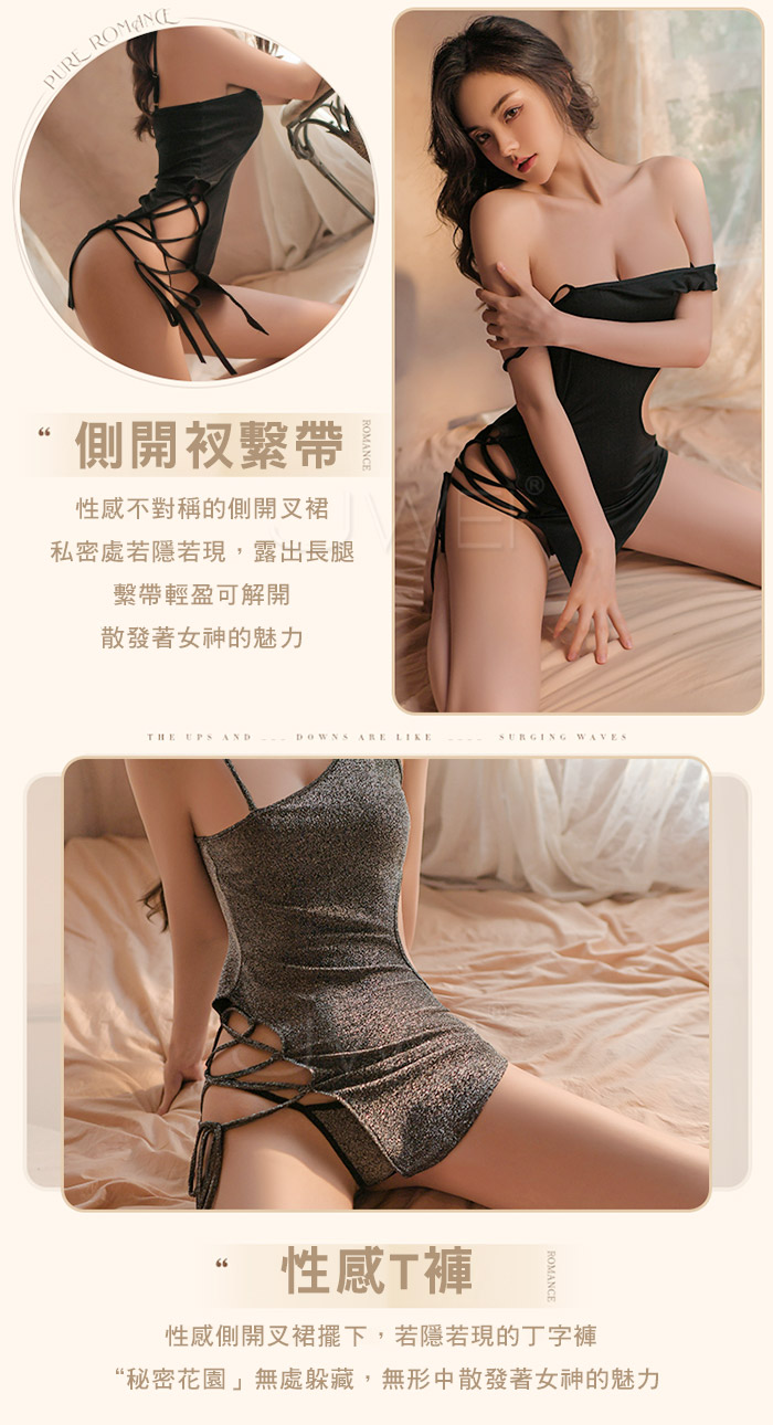 | 閃耀風尚.性感露溝側開衩繫帶不規則連身裙2件組(粉銀)