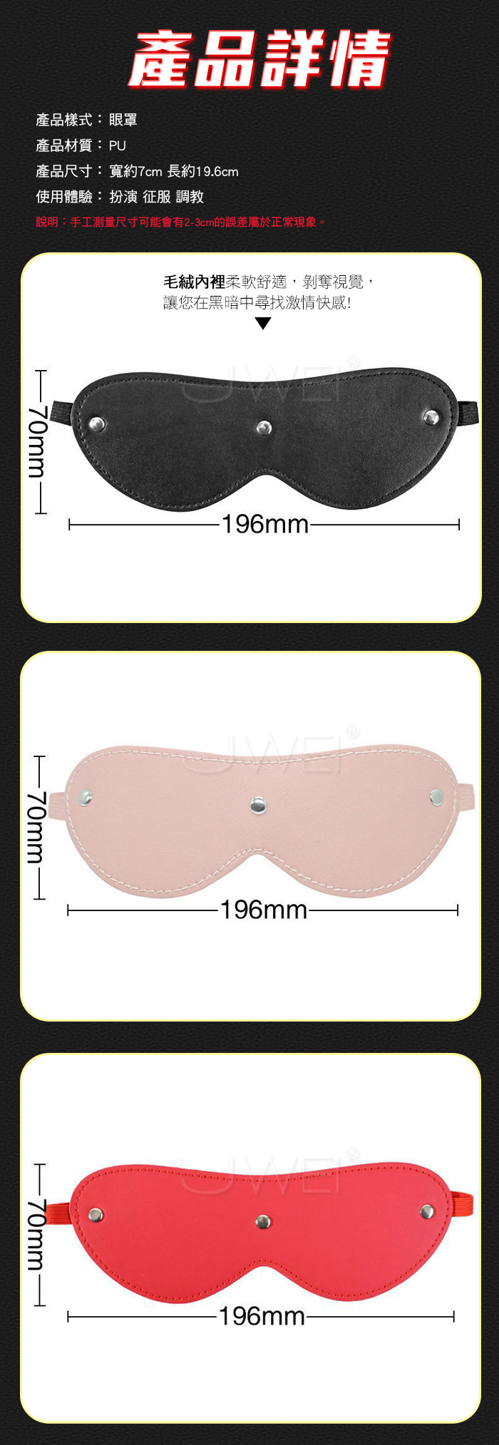 遮住雙眼,完全沈浸在情趣的快感之中,令雙方盡情體會性愛的不同樂趣, 神秘的感官剌激,挑起你的性慾用於性愛行動中,體驗不一樣的情趣......