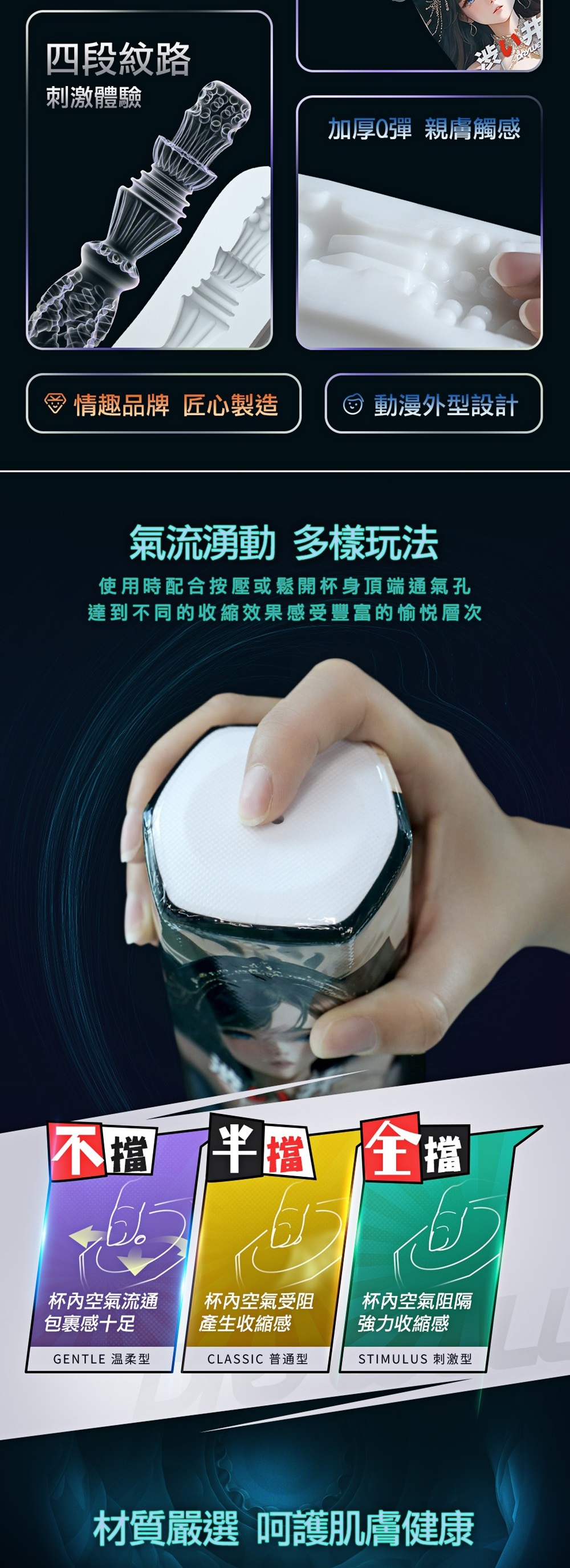 氣流湧動多樣化玩法,使用時配合按壓或鬆開杯身頂端通氣孔,達到不同的收縮效果感受豐富的愉悅層次。