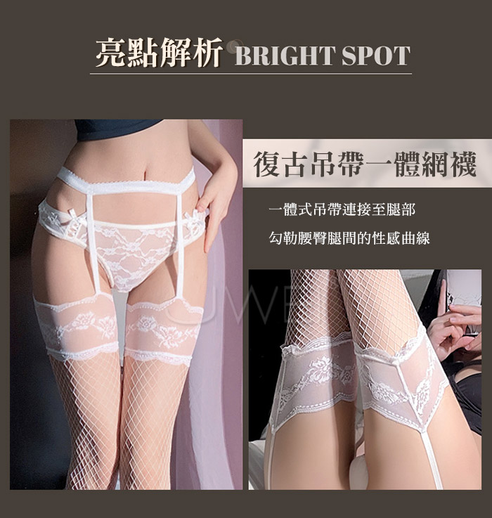 | 誘愛情網.法式蕾絲花邊連腰吊帶一體網襪-白