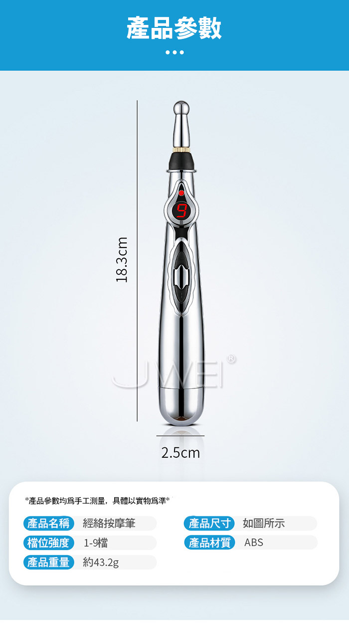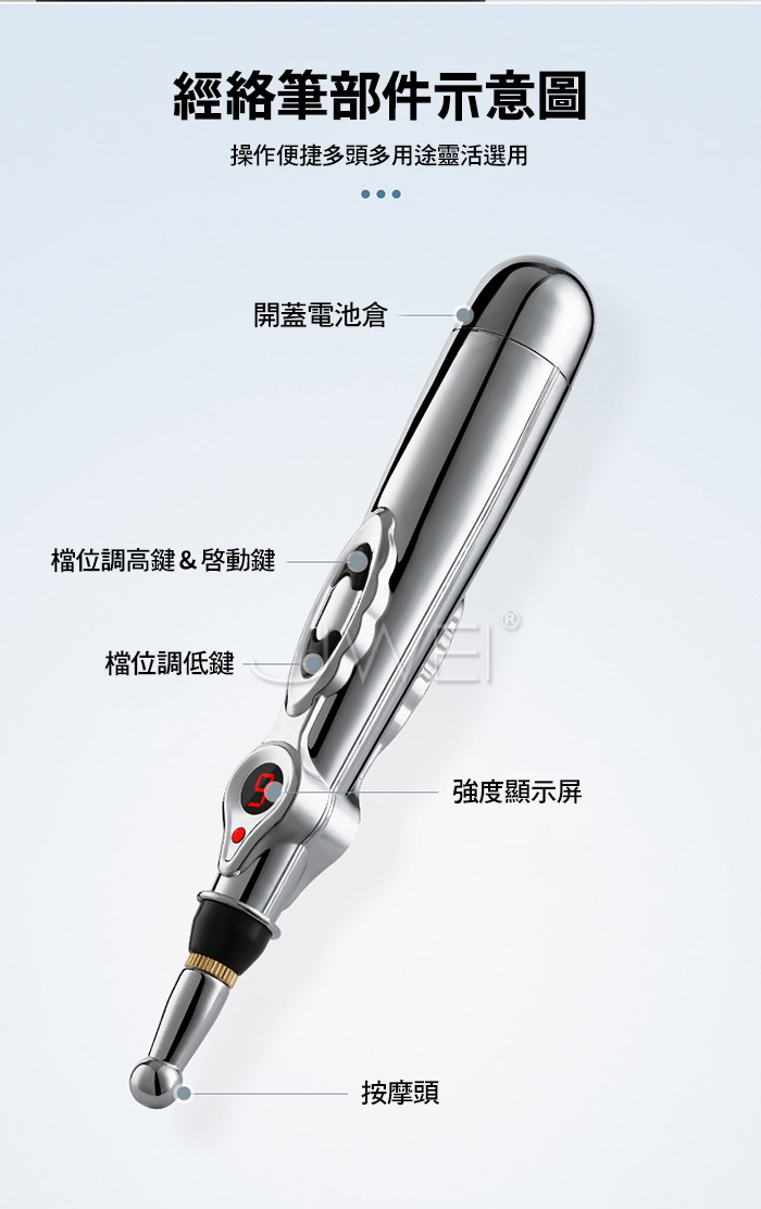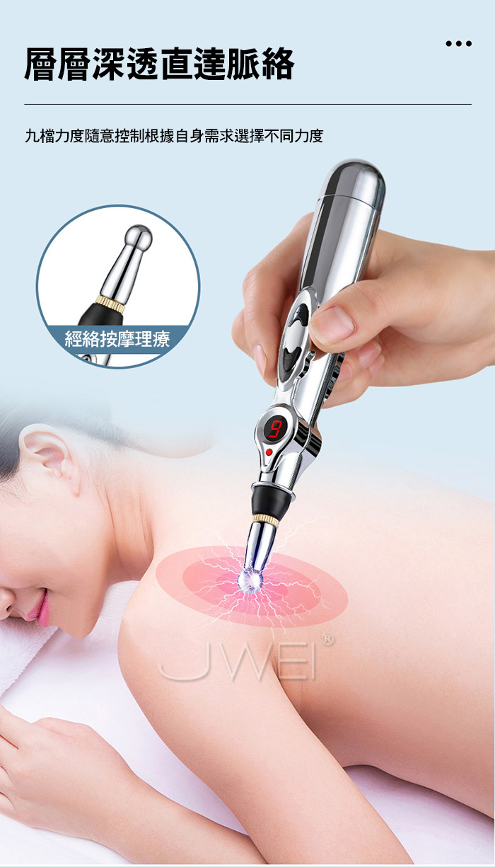 物理治療按摩經絡筆﹐生物微電脈衝 無須扎針也能深透人體穴位﹐進行深淺層的交替脈衝按摩 皮膚刺痛小﹐老人也能輕鬆使用,脈衝按摩可刺激你的穴位 通過生物電穿透人體表面組織進行淺部刺激 打通經脈鬱結﹐更加通暢! ■材質: ABS ■規格: 詳如圖片標示 ■特色: 9檔強度、經絡按摩、刺激穴位 ■供電方式: 3號電池