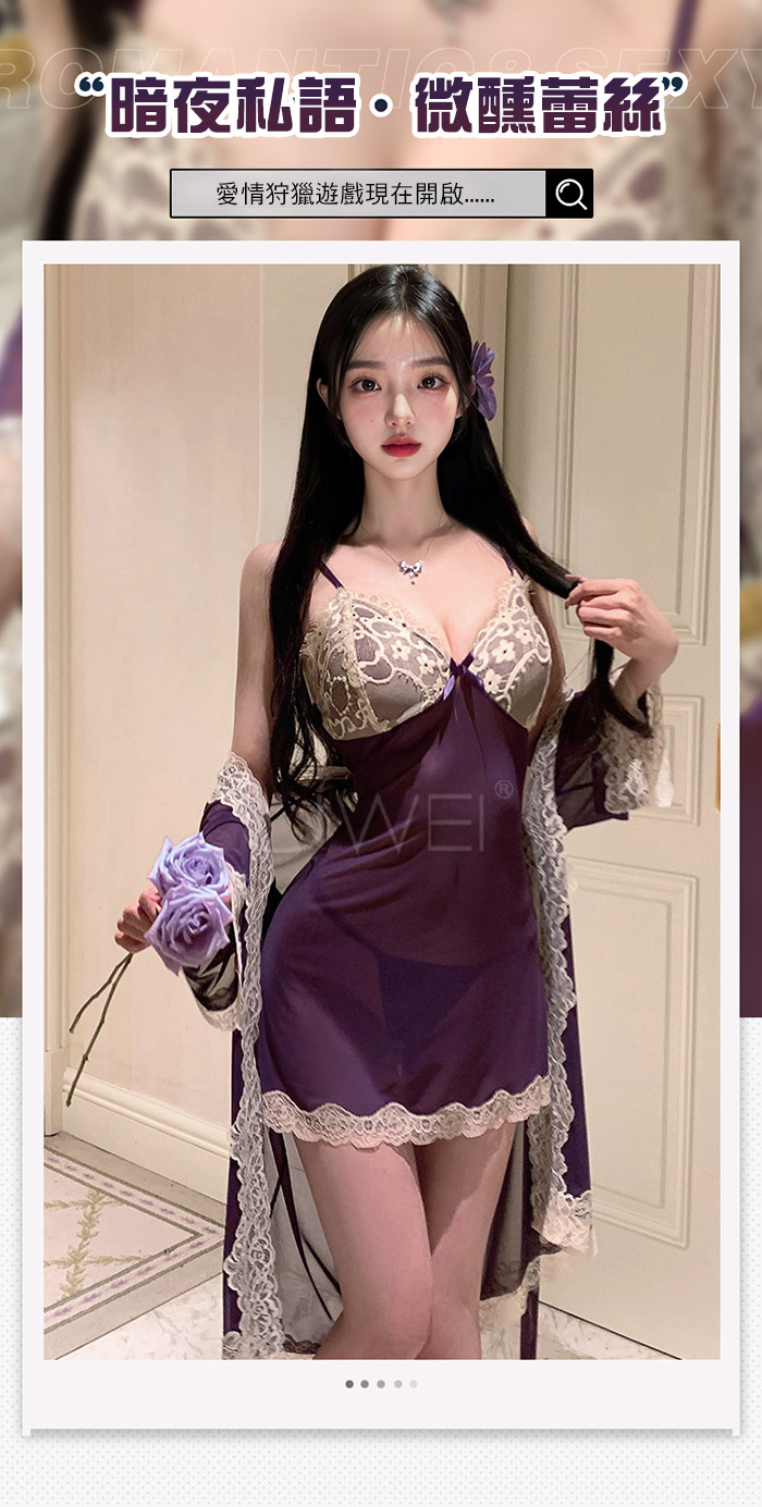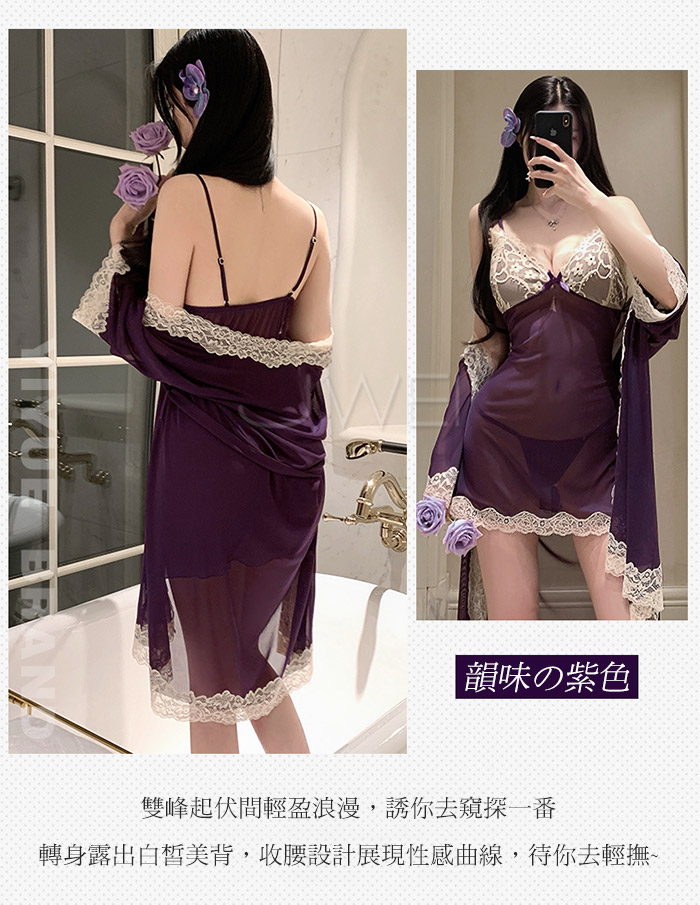 ►您現在的位置:首頁>微醺蕾絲.性感深V露溝睫毛蕾絲覆胸美背睡裙-紫色【外袍+睡裙+T褲】